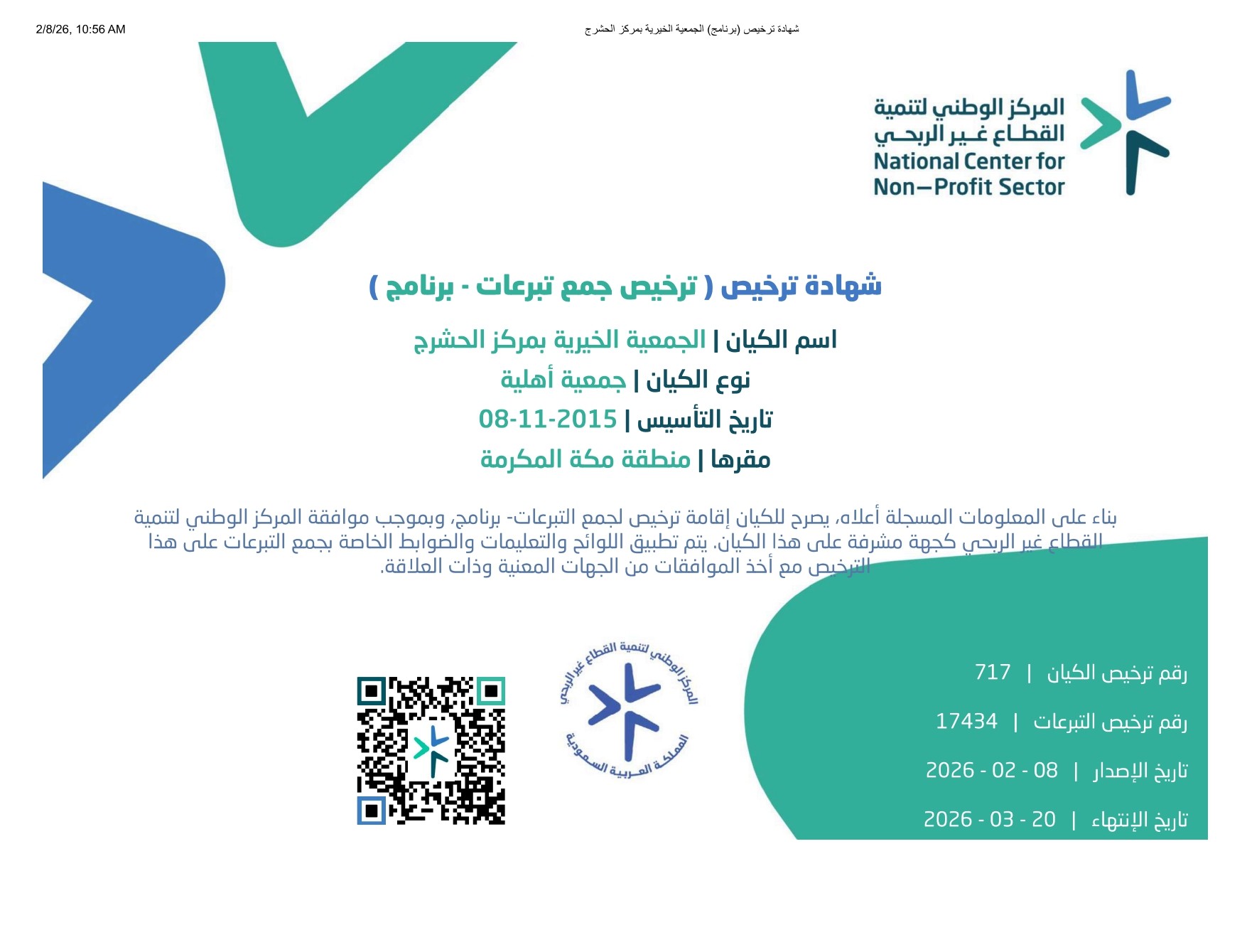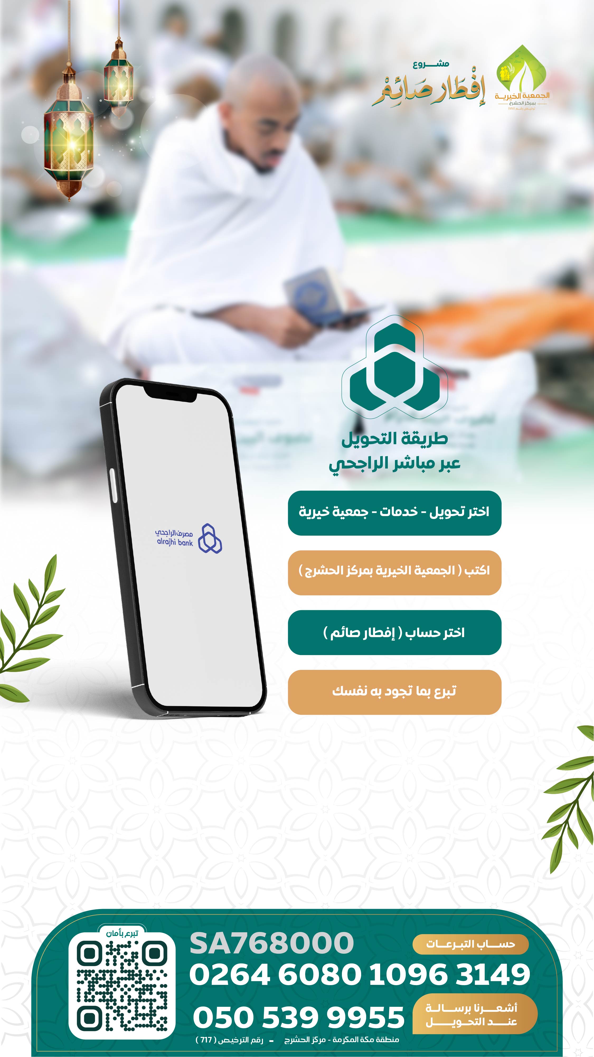 تبرعك آمن وموثق؛ فجمعية الحشرج مؤسسة رسمية مرخصة برقم (717). فبادر بالبذل الآن